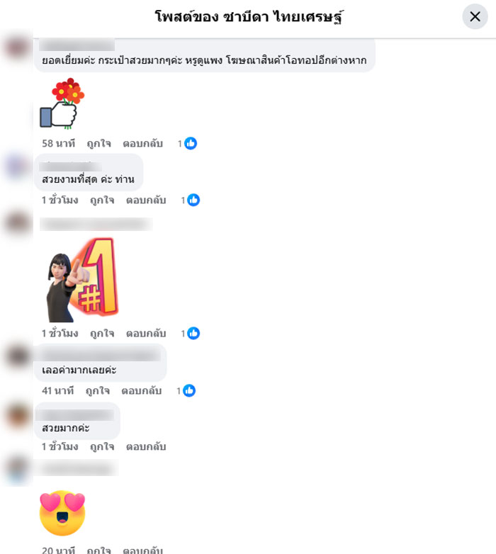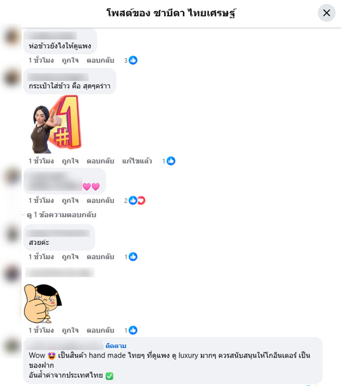 ทั้งนี้ ภายหลังโพสต์ดังกล่าวเผยแพร่ออกไป มีผู้เข้ามาแสดงความคิดเห็นเป็นจำนวนมาก อาทิ "ห่อข้าวยังไงให้ดูแพง , กระเป๋าใส่ข้าว คือ สุดๆคร่าา , สวยค่ะ , Wow เป็นสินค้า hand made ไทยๆ ที่ดูแพง ดู luxury มากๆ ควรสนับสนุนให้โกอินเตอร์ เป็นของฝากอันล้ำค่าจากประเทศไทย , ยอดเยี่ยมค่ะ กระเป๋าสวยมากๆค่ะ หรูดูแพง โฆษณาสินค้าโอทอปอีกต่างหาก , สวยงามที่สุด ค่ะ ท่าน , เลอค่ามากเลยค่ะ , สวยมากค่ะ เป็นต้น"