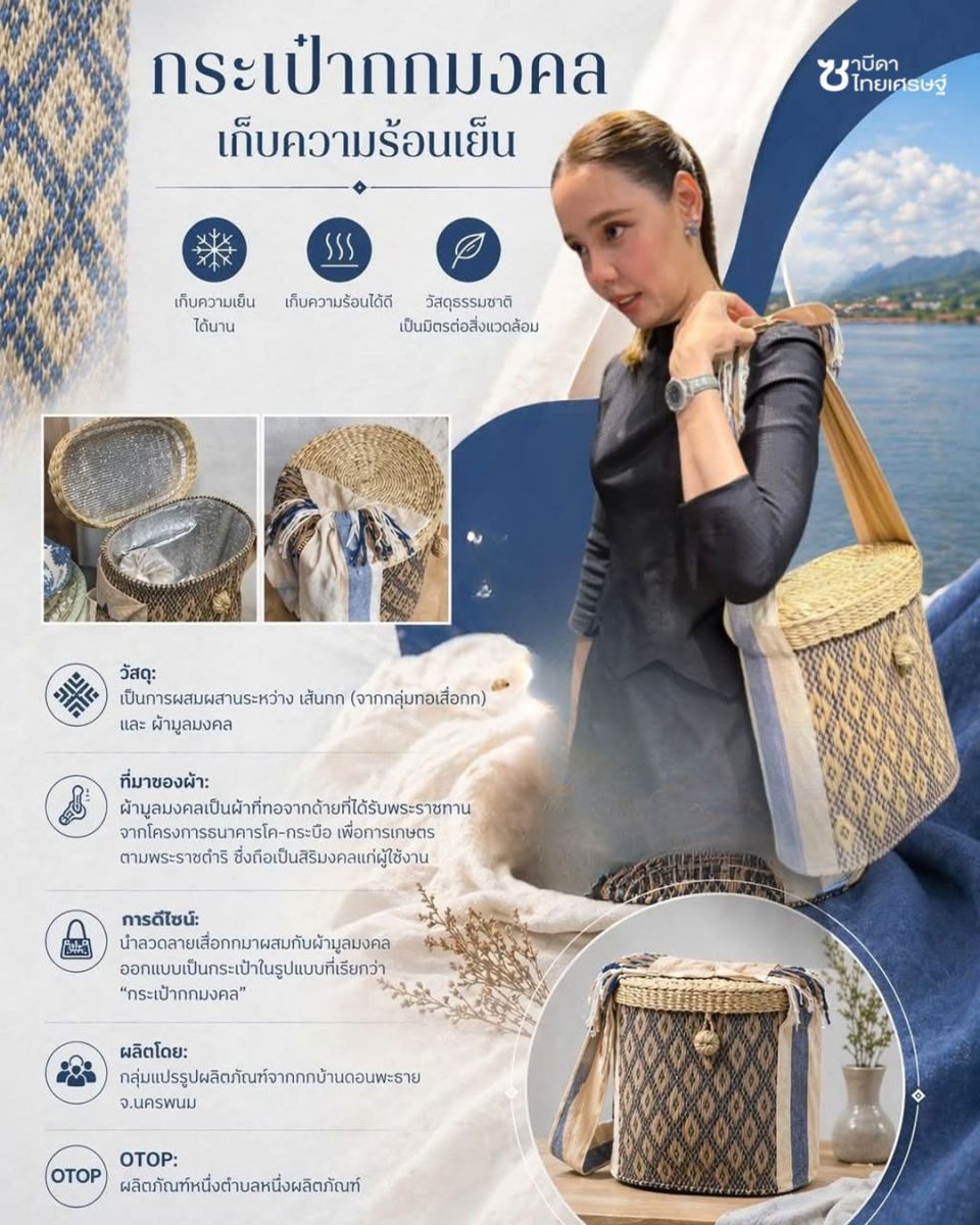 ความพิเศษอยู่ที่การผสานวัสดุอันทรงคุณค่าเส้นกกที่นำมาถักทอด้วยความประณีต ผ้าทอจากด้ายพระราชทาน โครงการธนาคารโค-กระบือ เพื่อการเกษตรตามพระราชดำริ เสริมความเป็นสิริมงคลให้กับผู้ใช้งาน