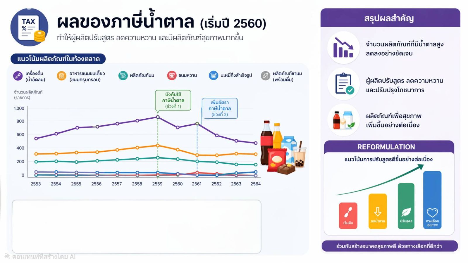 “ปัจจุบันเมื่อเราเดินเข้าร้านสะดวกซื้อ จะพบเครื่องดื่มสูตร “น้ำตาลน้อย” หรือ “ไม่มีน้ำตาล” เพิ่มขึ้นถึง 35% ซึ่งช่วยให้คนไทยเข้าถึงเครื่องดื่มที่ดีต่อสุขภาพได้ง่ายกว่าแต่ก่อน”
