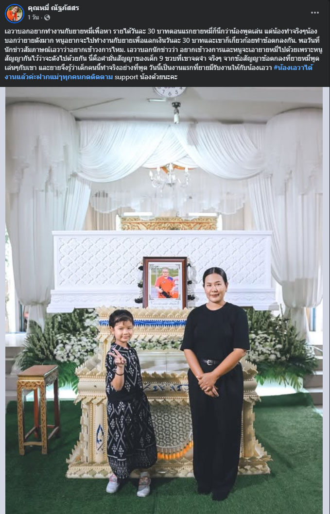 โดยระบุว่า "เอวาบอกอยากทำงานกับยายหมี่เพื่อหารายได้วันละ 30 บาท ตอนแรกยายหมี่ก็นึกว่าน้องพูดเล่น แต่น้องทำจริงๆ น้องบอกว่ายายดังมาก หนูอยากจะไปทำงานกับยายเพื่อแลกเงินวันละ 30 บาทและเขาก็เกี่ยวก้อยทำข้อตกลงกัน