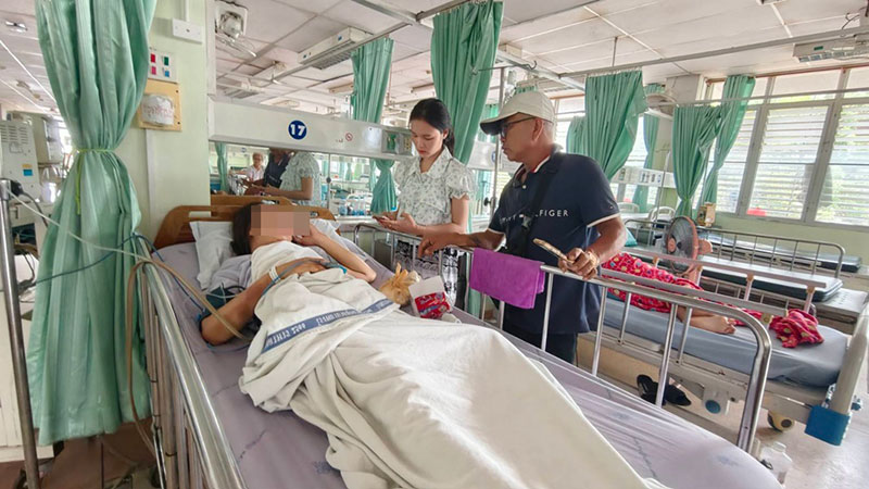 ซึ่งขณะเกิดเหตุตนได้ร้องให้คนช่วย เพื่อนบ้านก็ได้โทรศัพท์แจ้งศูนย์วิทยุ 191 ให้มาระงับเหตุ ตำรวจสายตรวจ สภ.ศรีสงคราม ก็ได้ออกมาพบรถอยู่ปากซอยตรงข้ามวัดป่าบ้านดงขวาง ต.บ้านเอื้อง อ.ศรีสงคราม จ.นครพนม ตำรวจจึงควบคุมตัวนายโจ้ เพราะมีพฤติการณ์ที่อาจจะก่ออันตรายได้ และเห็นสภาพตนที่มีเลือดออกเต็มใบหน้าก็รีบนำส่งโรงพยาบาลศรีสงคราม แต่อาการหนักจึงส่งรักษาต่อที่โรงพยาบาลนครพนม ได้รับการดูแลเป็นอย่างดีจากแพทย์ พยาบาล ตอนนี้เลือดที่ออกในสมองหยุดไหลแล้ว เหลือแต่กระดูกซี่โครงที่หักต้องใช้เวลารักษา ยืนยันจะดำเนินคดีกับอดีตผัวคนนี้ให้ถึงที่สุด