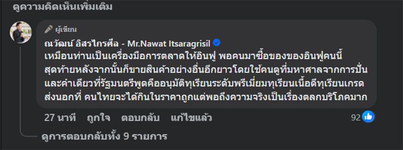 เหมือนท่านเป็นเครื่องมือการตลาดให้อินฟู พอคนมาซื้อของของอินฟูคนนี้สุดท้ายหลังจากนั้นก็ขายสินค้าอย่างอื่นอีกยาวโดยใช้คนดูที่มหาศาลจากการปั่นและคำเดียวที่รัฐมนตรีพูดคืออนุมัติทุเรียนระดับพรีเมี่ยมทุเรียนเนื้อดีทุเรียนเกรดส่งนอกที่ คนไทยจะได้กินในราคาถูกแต่พอถึงความจริงเป็นเรื่องตลกบริโภคมาก