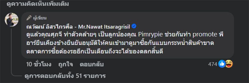 ดูแล้วคุณศุภจี ทำตัวคล้ายๆ เป็นลูกน้องคุณ Pimrypie ช่วยกันทำ promote พีอาร์ยืนเคียงข้างยืนยันอนุมัติให้คนเข้ามาดูมาซื้อกันแบบกระหน่ำสินค้าขาดตลาดการซื้อต้องรออีกเป็นเดือนถึงจะได้ของตลกสิ้นดี