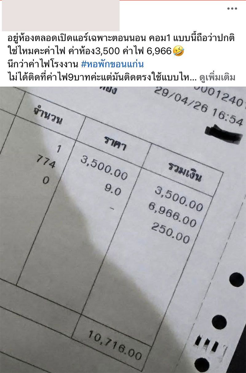 โดยผู้โพสต์ ระบุว่า “อยู่ห้องตลอด เปิดแอร์เฉพาะตอนนอน คอมพิวเตอร์ 1 เครื่อง แบบนี้ถือว่าปกติใช่ไหมคะค่าไฟ ค่าห้อง 3,500 ค่าไฟ 6,966 นึกว่าค่าไฟโรงงาน #หอพักขอนแก่น”