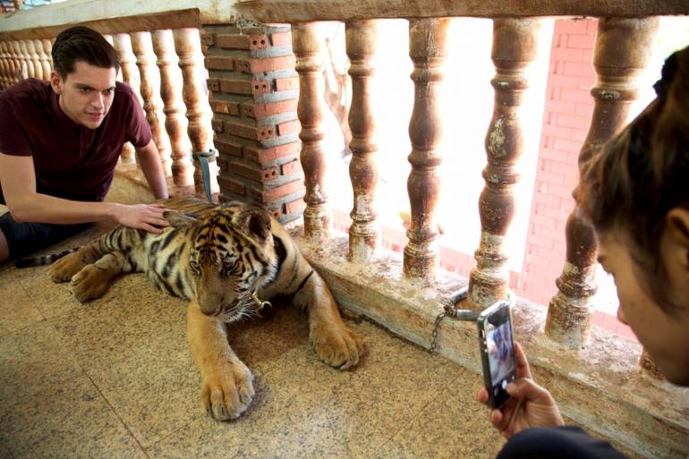 นักท่องเที่ยวกำลังถ่ายรูปคู่กับลูกเสือวัย 5 เดือน ณ วัดเสือ ซึ่งต้องบริจาคเงินถึง 4,900 บาท หากต้องการป้อนนมและเล่นกับลูกเสือ (ภาพ: Sharon Guynup, National Geographic)