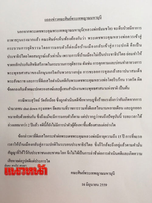 16 มิ.ย.59 หลังจากที่เจ้าหน้าที่ ดีเอสไอ นำโดย พ.ต.ท.สุริยา สิงหกมล รองอธิบดีกรมสอบสวนคดีพิเศษ พร้อมหมายค้น เดินทางมาที่วัดพระธรรมกาย ด้านประตู 7 โดยเจ้าหน้าที่วัดได้เปิดประตูวัด เพื่อให้เจ้าหน้าที่เข้ามา และกำลังเจรจา ล่าสุด ทางศิษย์ ได้แถลงบางตอนว่า ขณะนี้ บ้านเมืองไม่ได้อยู่ในช่วงปกติ โดยมีการคุกคามทางกฎหมาย คดีดังกล่าว มีอายุความ 15 ปี ซึ่งน่าจะรอให้บ้านเมือง กลับเข้าสู่ประชาธิปไตยก่อน