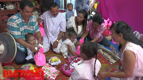 สำหรับบรรยากาศการจัดงานครั้งนี้จัดให้มีพิธีการเหมือนงานมงคลสมรสผู้ใหญ่ทุกประการ โดยในตอนเช้ามีพิธีการแห่ขันหมากจากทางเข้าหน้าบ้าน ลอดซุ้ม ผ่านประตูเงิน ประตูทอง ประตูนาค เชิญเจ้าสาวออกจากห้อง และมอบเงินสินสอด จำนวน 20,000 บาท สร้อยคอทองคำน้ำหนัก 1 บาท และประกอบพิธีสงฆ์ จากนั้น เป็นพิธีการรับไหว้ ซึ่ง ด.ช. ณัฐพล แซ่โง้ว อายุ 3 ขวบ1เดือน และ ด.ญ.ณิญะดา แซ่โง้ว คู่บ่าวสาวในพิธีได้ร่วมรับไหว้จากญาติผู้ใหญ่จำนวนหลากหลายคน จากนั้นเป็นการส่งตัวเข้าหอและงานเลี้ยงฉลอง ซึ่งเชิญแขกคนคุ้นเคยและเพื่อนบ้านใกล้เคียง