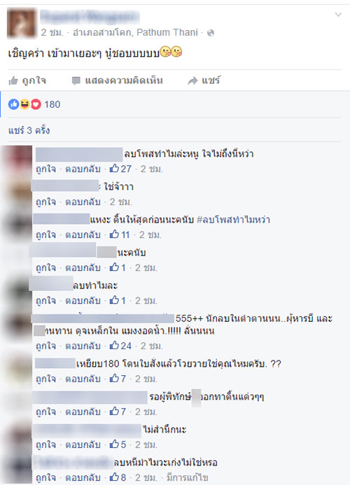 ทั้งนี้ หลังจากที่เพจดังกล่าวได้นำเรื่องราวดังกล่าวออกมาเผยแพร่ ทำให้มีผู้คนเข้าไปแสดงความคิดเห็นเป็นจำนวนมาก รวมทั้งบางส่วนได้เข้าไปต่อว่า และเตือนสติในเฟซบุ๊กส่วนตัวของพริตตี้สาว ซึ่งหลังจากที่ผู้สื่อข่าวได้ทำการตรวจสอบไปที่เฟซบุ๊กของพริตตี้สาว พบว่า โพสต์ดังกล่าวถูกลบออกไปแล้ว