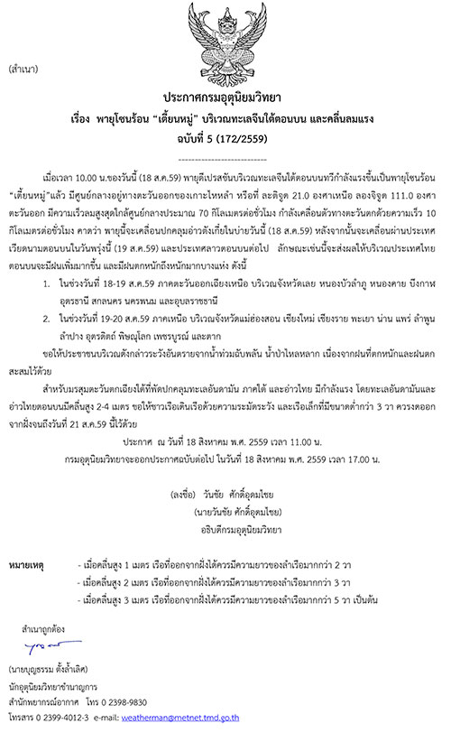 18 ส.ค.59 กรมอุตุนิยมวิทยา ประกาศพายุโซนร้อน "เตี้ยนหมู่" บริเวณทะเลจีนใต้ตอนบน และคลื่นลมแรง ฉบับที่ 5 ระบุว่า เมื่อเวลา 10.00 น.ของวันนี้ พายุดีเปรสชันบริเวณทะเลจีนใต้ตอนบนทวีกำลังแรงขึ้นเป็นพายุโซนร้อน "เตี้ยนหมู่" แล้ว มีศูนย์กลางอยู่ทางตะวันออกของเกาะไหหลำ หรือที่ ละติจูด 21.0 องศาเหนือ ลองจิจูด 111.0 องศาตะวันออก มีความเร็วลมสูงสุดใกล้ศูนย์กลางประมาณ 70 กิโลเมตรต่อชั่วโมง กำลังเคลื่อนตัวทางตะวันตกด้วยความเร็ว 10 กิโลเมตรต่อชั่วโมง คาดว่า พายุนี้จะเคลื่อนปกคลุมอ่าวตังเกี๋ย ในบ่ายวันนี้ หลังจากนั้นจะเคลื่อนผ่านประเทศเวียดนามตอนบน ในวันพรุ่งนี้ (19 ส.ค.) และประเทศลาวตอนบนต่อไป