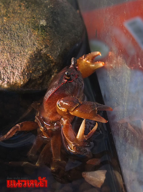 ทางด้าน อาจารย์จิรัชญา ผาลา ครูวิทยาศาสตร์ของโรงเรียนฯ กล่าวว่า เดิมปูชนิดนี้หาง่ายและพบเห็นในลำห้วยแม่แสลบ แต่เมื่อสภาพแวดล้อมเปลี่ยนแปลงไปและอาจมีการจับมาเป็นอาหารทำให้ปริมาณลดลงกระทั่งมีการค้นพบและศึกษาในปี 2538 จึงทราบว่ามีเอกลักษณ์เฉพาะพันธุ์และเกือบจะสูญพันธุ์อีกด้วย กระทั่งมีการอนุรักษ์ช่วง 2-3 ปีก่อน จึงเริ่มพบได้ง่ายขึ้นในลำห้วย แต่ไม่สามารถขยายพันธุ์ได้เพราะที่ผ่านมาทางเจ้าหน้าที่ประมงเคยนำปูตัวผู้และตัวเมียไปทดลองผสมและขยายพันธุ์ปรากฎว่าได้ลูกออกมาไม่มีคุณลักษณ์เหมือนรุ่นพ่อแม่ นอกจากนี้เมื่อนำปูออกจากลำห้วยนี้ไปปูไม่มีสีสันเหมือนเดิมอีกโดยกลับจะดำไปเรื่อยๆ ด้วย