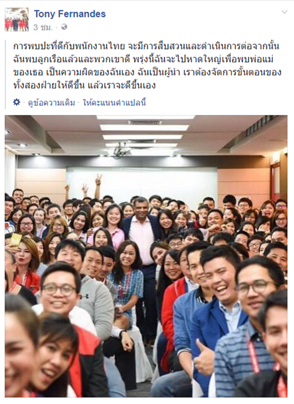ล่าสุด นายโทนี่ เฟอร์นานเดส ประธานเจ้าหน้าที่บริหารกลุ่มแอร์เอเชีย ได้เดินทางมาถึงกรุงเทพฯ และเรียกประชุมพนักงานทุกคน ที่ท่าอากาศยานดอนเมือง พร้อมกล่าวในที่ประชุมยืนยันว่าตนยึดมั่นในนโยบายของบริษัทฯ ที่ว่า "พนักงานมาเป็นที่หนึ่ง ลูกค้าคือที่สอง ถ้าพนักงานมีความสุขในการทำงาน เขาก็จะดูแลลูกค้าได้มีความสุขเช่นกัน" และยืนยันที่จะปกป้องพนักงานทุกคนในฐานะครอบครัวเดียวกัน