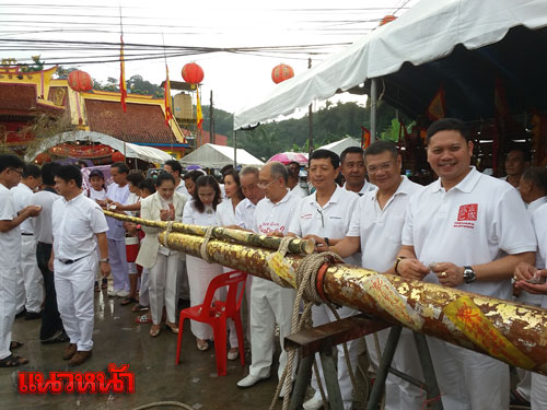30 ก.ย.59 เมื่อเวลา 17.00 น. ที่ศาลเจ้าแม่ม่าจ้อโป๋ (อ๊าม) เขตเทศบาลเมืองพังงา นายภัคพงศ์ ทวิพัฒน์ ผู้ว่าราชการจังหวัดพังงา พร้อมด้วยนายบำรุง ปิยนามวาณิช นายก อบจ.พังงา นางกันตวรรณ ตันเถียร กุลจรรยาวิวัฒน์ อดีต ส.ส.พังงา หัว ได้ร่วมทำพิธียกเสาโกเต้งไว้ที่หน้าศาลเจ้า เพื่อประกอบพิธีอัญเชิญตะเกียง 9 ดวงขึ้นไปไว้ที่ยอดเสาโกเต้งที่มีความสูงที่สุดในประเทศไทย เป็นเสาต้นเดียวไม่มีรอยต่อยาวถึง 21.99 เมตร เพื่อเป็นสัญลักษณ์ว่าพิธีถือศีลกินผัก ในช่วงงานเทศกาลกินผักนั้นทางศาลเจ้าได้จัดพิธีกรรมหลายอย่าง เริ่มจากพิธีอัญเชิญเทพเจ้าหยกอ๋องซ่งเต่ และกิ้วอ๋องไตเต่ มาเป็นประธานในพิธีถือศีลกินผัก ซึ่งจะมีพิธีโก้ยเฉ่งอิ๋ว หรือพิธีปัดเป่าสิ่งชั่วร้ายออกจากบ้านของผู้ที่ร่วมถือศีลกินผัก พิธีอัญเชิญล่ำเต้า-ปักเต้า (เทพผู้ถือบัญชีเป็น-บัญชีตาย) พิธีไหว้พระสวดมนต์เป็นประจำในทุกๆ ทั้งนี้เพื่อเป็นการประกาศว่า ได้เริ่มพิธีถือศีลกินผักอย่างเป็นทางการ ซึ่งมีความเชื่อว่าผู้ที่ได้เข้ามาร่วมในพิธีนี้จะถือว่าได้เป็นผู้ร่วมพิธีถือศีลกินผักอย่างสมบูรณ์ ซึ่งในปีนี้จัดขึ้นในระหว่างวันที่ 1 – 9 ต.ค.59