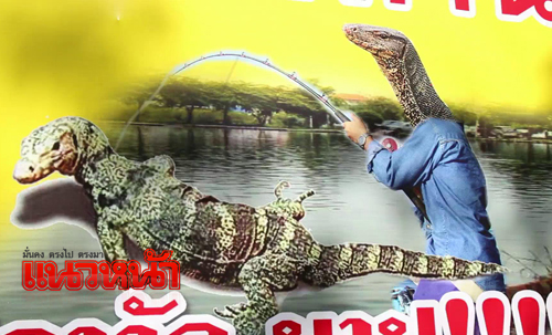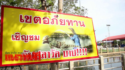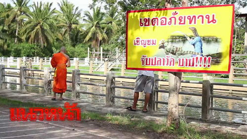4 ก.ย.59 ผู้สื่อข่าวรายงานว่า ที่บริเวณบ่อปลาภายในวัดลาดเป้ง ต.นางตะเคียน อ.เมือง จ.สมุทรสงคราม ฝั่งตรงข้าม สภ.ลาดใหญ่ มีการขึ้นป้ายข้อความว่า ‘เขตอภัยทาน เชิญชม ‘เหี้ย’ จับปลาวัดบาป’ บริเวณโดยรอบๆบ่อเลี้ยงปลาจำนวน 6 ป้าย โดยภายในป้ายมีรูปตัวเงินตัวทอง หรือ ‘เหี้ย’ ในลักษณะกำลังตกเบ็ด ภายในบ่อปลา