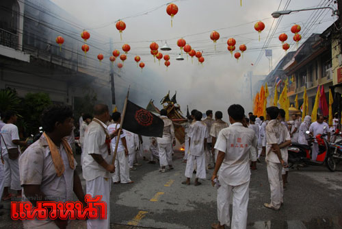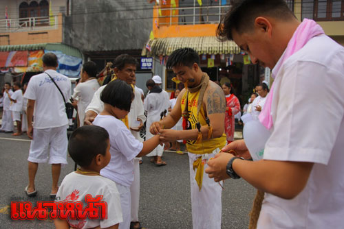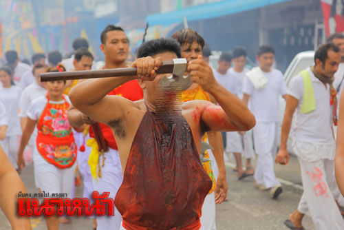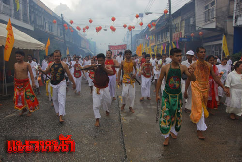 5 ต.ค.59 เมื่อเวลา 15. 00 น. วานนี้ (4 ต.ค.59) ผู้สื่อข่าวรายงาน ที่ ตลาดย่านยาว อ.ตะกั่วป่า จ.พังงา ศาลเจ้าพ่อกวนอู(โรงพระตลาดใต้ ศาลเจ้าเก่าแก่คู่เมืองตะกั่วป่า) นำขบวนเกี้ยว พร้อมร่างทรงนำของแหลม ของมีคมฟันแทงตามร่างกาย โดยมีประชาชนจำนวนมากตั้งโต๊ะบูชาต้อนรับองค์เทพเจ้าที่ประทับอยู่ในร่างทรง เพื่อจะได้เข้ามาทำพิธีปัดเป่าความไม่ดีออกไปจากบ้านเรือน พร้อมกันนั้นเหล่าร่างทรงยังได้มีการแสดงอิทธิฤทธิ์ด้วยการใช้ของแหลมของมีคมฟันแทงตลอดเส้นทาง ไม่ว่าจะเป็นการใช้เหล็กแหลมแทงตามร่างกาย การใช้มีดดาบ ของแหลม ของมีคม ฟันตามร่างกาย เพื่อเป็นการรับเคราะห์และสิ่งไม่ดีแทนประชาชน