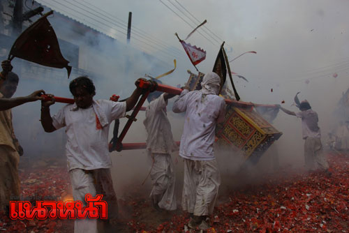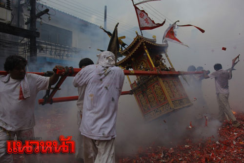 ก่อนที่ขบวนเกี้ยวจะผ่านมาและประชนชนจะทำการจุดประทัดใส่เกี้ยว ซึ่งเชื่อกันว่า การจุดประทัดเป็นการปัดเป่ารังควาญ ผีสางให้ออกไปไกล ๆ บ้านเรือนประชาชน ส่วนการจุดประทัดจำนวนมากนั้นก็เกิดจากการที่เหล่าประชาชนที่ถือศีลกินผักได้บนบานเอาไว้ ไม่ว่าจะเป็น ให้ค้าขายกำไร การงานราบรื่น หรือ ความเจริญเข้ามาอย่างต่อเนื่อง เมื่อประสบความสำเร็จก็จะยิ่งจุดประทัดมากขึ้นกว่าเดิมทุกปี บ้างก็เชื่อว่า ยิ่งเกี้ยวอยู่ที่หน้าบ้านตัวเองนานเท่าไรก็จะยิ่งมีแต่สิ่งดี ๆ เข้ามาในบ้านตนเองมากเท่านั้น