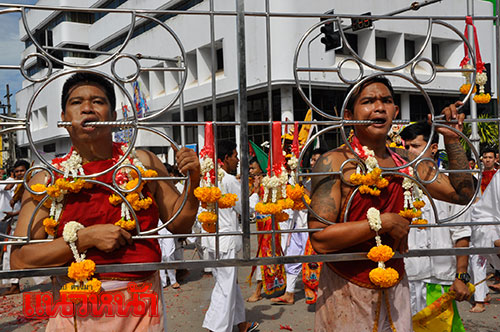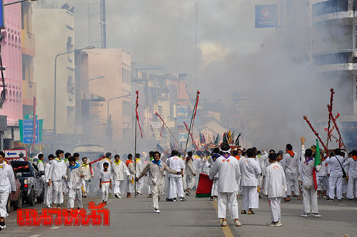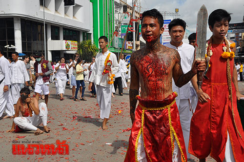 นอกจากนี้ยังมีขบวนริ้วธง ขบวนมังกร และการเล่นเกี้ยว โดยผู้ที่เล่นเกี้ยวนั้นจะเล่นเกี้ยวขณะจุดประทัด ทำให้เสียงดังสนั่นในบริเวณที่ขบวนองค์ศักดิ์สิทธิ์ผ่าน ขณะเดียวกันก็มีประชาชนและนักท่องเที่ยว ได้ติดตามเฝ้าชมในทุกจุดที่มีขบวนแห่องค์ศักดิ์สิทธิ์เดินผ่าน ทำให้บรรยากาศภาพรวมเป็นไปอย่างคึกคักตลอดทุกเส้นทาง ซึ่งมีม้าทรงประมาณเกือบ 600 คนและสำหรับการแสดงอภินิหารของบรรดาม้าทรง มีกว่า 300 คน ยังคงมีเหมือนทุกปีที่ผ่านมา อาทิ การใช้เหล็กแหลมแทงตามปาก ใบหน้า และลำคอ หรือของมีคมและสิ่งของอื่นๆ มาทิ่มแทงตามร่างกาย โดยเฉพาะการนำเหล็กหน้าต่างขนาดใหญ่มาแทงปาก แล้วร่วมเดินขบวนแห่ง ซึ่งสร้างความหวาดเสียว ให้กับประชาชนและนักท่องเที่ยวเป็นอย่างมาก พร้อมกันนี้ ประชาชนผู้มีจิตศรัทธาก็ยังมีการตั้งโต๊ะบูชาองค์ศักดิ์สิทธิ์