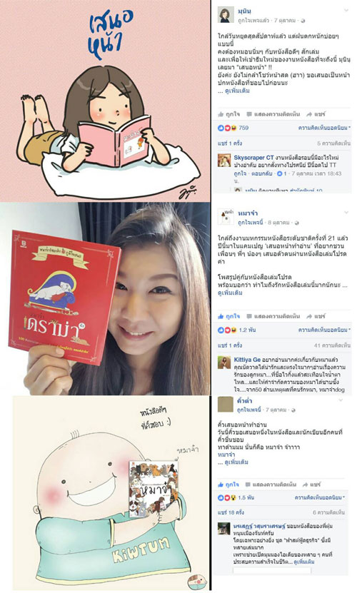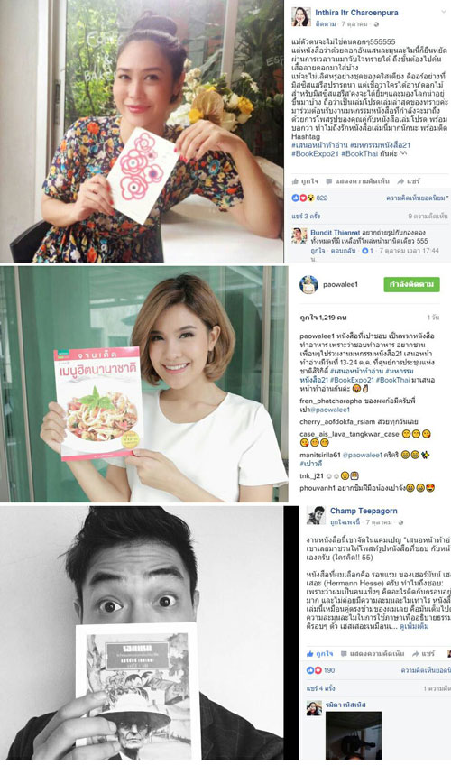 นายจรัญ กล่าวว่า มีเหล่า นักเขียน ดารา นักร้อง เนตไอดอล และผู้สนับสนุนอีกจำนวนมาก พร้อมใจกันโพสรูปหนังสือเล่มโปรด ติดแฮชแท็ก "เสนอหน้าท้าอ่าน" เพื่อเชิญชวนให้ไปร่วมงานมหรรมหนังสือในปีนี้ ไม่ว่า จะเป็น นิ้วกลม, คิ้วต่ำ, มุนิน, หมาจ๋า, แชมป์ ทีปกร, ทราย เจริญปุระ, เปาวลี พรพิมล, บอล-ยอด หนังพาไป, อาริตา-กันยามาส และ อีกหลากหลาย เพื่อต้องการแสดงพลังให้เห็นว่า ยังเชื่อมั่นในการสร้างสรรค์และผลิตหนังสือคุณภาพของคนไทย