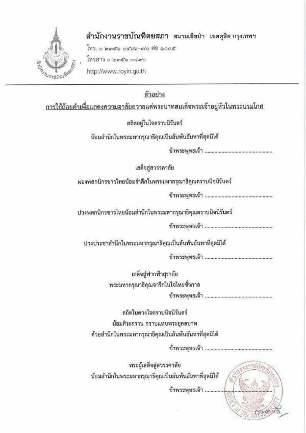 สถิตในดวงใจตราบนิจนิรันดร์ น้อมศิระกราน กราบแทบพระยุคลบาท ด้วยสำนึกในพระมหากรุณาธิคุณเป็นล้นพ้นอันหาที่สุดมิได้ ข้าพระพุทธเจ้า ..............................