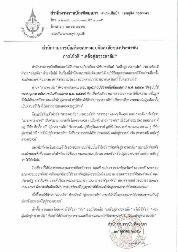 14 ต.ค.59 เฟซบุ๊กเพจ "ราชบัณฑิตยสภา" ได้โพสต์รูปภาพและข้อความ ตอบข้อสงสัยของประชาชน 2 เรื่อง คือ ราชาศัพท์ "สวรรคต" และการใช้วลี "เสด็จสู่สวรรคาลัย" โดยกรณีราชาศัพท์ "สวรรคต" สำนักงานราชบัณฑิตยสภาตอบข้อสงสัยว่า การใช้คำราชาศัพท์ของคำว่า "ตาย" คณะกรรมการจัดทำหลักเกณฑ์การใช้คำราชาศัพท์ของสำนักงานราชบัณฑิตยสภาได้จัดทำไว้ ดังนี้