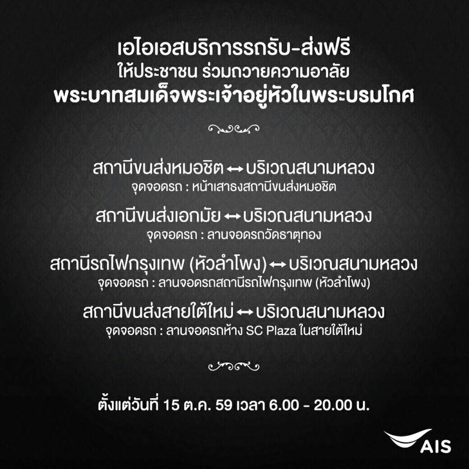 ทั้งนี้ เอไอเอส ยังมีบริการรับ-ส่ง ฟรี! ให้ประชาชนที่จะเดินทางมาร่วมถวายความอาลัย พระบาทสมเด็จพระเจ้าอยู่หัวในพระบรมโกศ โดยมีเส้นทางดังต่อไปนี้
