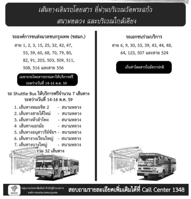 ทั้งนี้ ขสมก. ได้จัดรถโดยสาร Shuttel Bus อำนวยความสะดวกแต่ละจุด ปลายทางสนามหลวง ให้บริการฟรี รวม 32 เส้นทาง ดังนี้