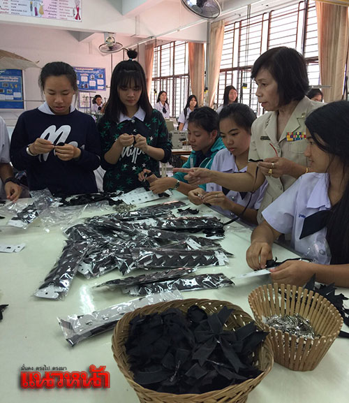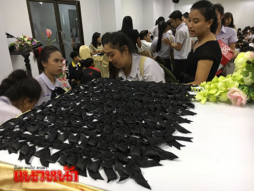 17 ต.ค.59 ผู้สื่อข่าวรายงานจากจังหวัดเชียงรายว่า ที่วิทยาลัยอาชีวศึกษาเชียงราย คณะครูและนักศึกษาจำนวนกว่า 350 คน ได้ช่วยกันนำผ้าสีดำมาตัดทำเป็นริบบิ้นเพื่อนำออกไปแจกจ่ายให้กับประชาชนในพื้นที่จังหวัดเชียงราย ถวายเป็นพระราชกุศล แด่พระบาทสมเด็จพระเจ้าอยู่หัวในพระบรมโกศ ซึ่งเสด็จสวรรคตเมื่อวันที่ 13 ตุลาคม 2559 ที่ผ่านมา เพื่อน้อมรำลึกถึงพระมหากรุณาธิคุณ ที่ทรงมีต่อพสกนิกรทุกหมู่เหล่า ตลอดพระชนชีพของพระองค์ท่าน โดยตั้งเป้าจัดทั้งหมดประมาณ 5,000 ชิ้น เพื่อให้ประชาชนนำไปติดกับเสื้อเพื่อร่วมไว้อาลัยภายหลังจากพบว่าเสื้อผ้าสีดำนั้นขาดตลาด