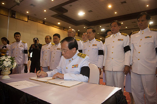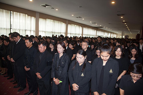 17 ต.ค.59 ผู้ช่วยศาสตราจารย์วุฒิศักดิ์ ลาภเจริญทรัพย์ อธิการบดีมหาวิทยาลัยรามคำแหง นำคณะผู้บริหาร บุคลากร ศิษย์เก่า และนักศึกษา ร่วมพิธีถวายราชสักการะและลงนามถวายความอาลัย พระบาทสมเด็จพระปรมินทรมหาภูมิพลอดุลยเดช ที่ห้องประชุม ชั้น 2 อาคารหอประชุมพ่อขุนรามคำแหงมหาราช โดยมีผู้เข้าร่วมพิธีถวายความอาลัยเป็นจำนวนมาก