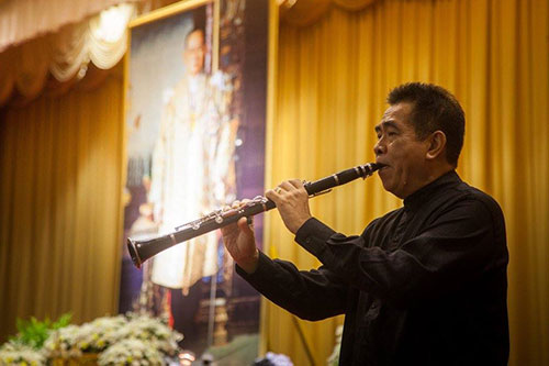 จากนั้น อาจารย์ธนิสร์ ศรีกลิ่นดี ศิลปินชั้นครูด้านดนตรีไทย ร่วมบรรเลงเพลงถวายความร่วมบรรเลงเพลงถวายความอาลัยในบทเพลง “แสงเทียน” และ “ความฝันอันสูงสุด” ต่อด้วย อธิการบดี ม.ร. นำบุคลากรและผู้เข้าร่วมงาน ลงนามถวายความอาลัย พระบาทสมเด็จพระปรมินทรมหาภูมิพลอดุลยเดช