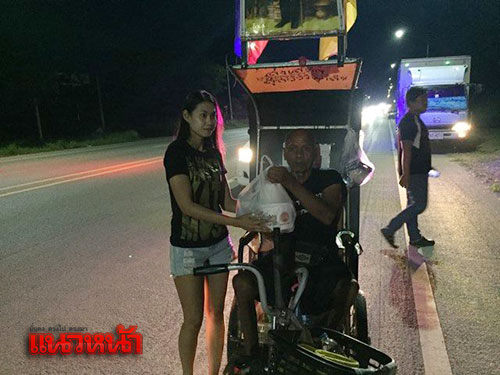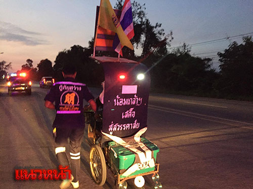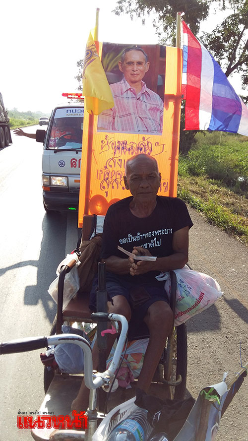 พ่อเฒ่าพิการวัย 84 ปี ชาว จ.บุรีรัมย์ โยกรถเข็นคนพิการพระราชทาน มุ่งหน้าเข้าสู่กรุงเทพมหานคร เพื่อสักการะพระบรมศพพระบาทสมเด็จพระเจ้าอยู่หัวในพระบรมโกศ เผยมีทุกวันนี้เพราะพระเมตตาของพระองค์ ผู้สัญจรผ่านไปมาเห็นนำเงินสิ่งของมอบให้เพื่อทั้งเป็นกำลังใจให้เดินทางสู่จุดมุ่งหมายและความตั้งใจ