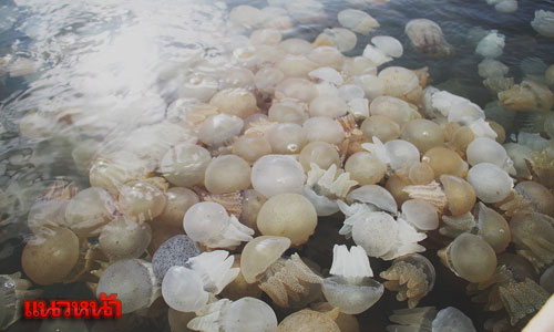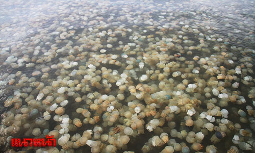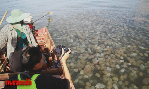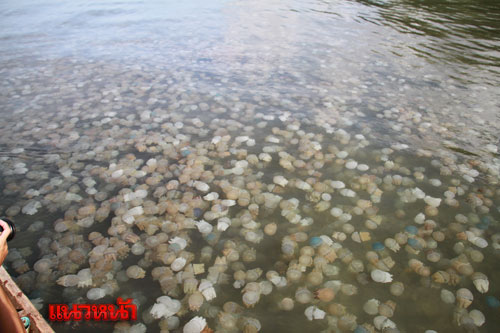 โดยคณะรองผู้ว่าฯ ได้ล่องเรือไปตามริมชายฝั่ง พบว่า ตลอดชายฝั่งมีแมงกะพรุนถ้วยลอยอยู่บนผิวน้ำยาวกว่า 2 กิโลเมตร ซึ่งบาดจุดพบมีแมงกะพรุนลอยอยู่เป็นกระจุกตัว ส่วนใหญ่แมงกะพรุนลอยที่พบจะเป็นสีขาวมากกว่า ซึ่งสีฟ้า สีส้ม และสีอื่นๆ มีน้อย และตัวยังไม่ใหญ่มากนัก เนื่องจากแมงกะพรุนเพิ่งจะเกิดได้เพียง 3-4 วันเท่านั้น