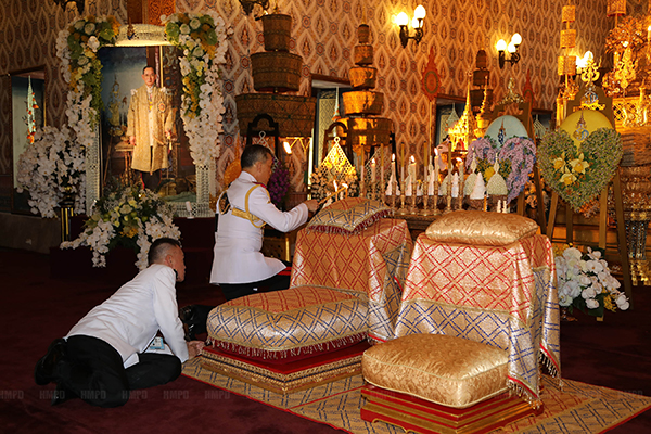 ในการนี้ สมเด็จพระบรมโอรสาธิราชฯ สยามมกุฎราชกุมารทรงจุดธูปเทียนเครื่องทองน้อยเเละเครื่องราชสักการะกราบถวายบังคมพระบรมศพ จากนั้นทรงจุดธูปเทียนเครื่ิองนมัสการบูชาพระพุทธรูปที่หน้าพระแท่นมหาเศวตฉัตร พระสงฆ์ 30 รูป ที่สวดพระพุทธมนต์แต่วันก่อน สวดถวายพรพระจบ ทรงประเคนภัตตาหาร พระสงฆ์พระราชทานฉันเสร็จแล้ว ทรงทอดผ้าไตร พระสงฆ์ทั้งนั้นสดับปกรณ์ถวายอนุโมทนา เจ้าพนักงานนิมนต์สมเด็จพระวันรัต วัดบวรนิเวศวิหาร ขึ้นนั่งยังอาสนะ ทรงจุดธูปเทียนเครื่องทรงธรรม สมเด็จพระราชาคณะถวายศีล