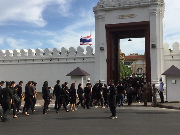ส่วนบรรยากาศลงนามถวายความอาลัย ตั้งแต่เช้ามือที่บริเวณหน้าประตูวิเศษไชยศรี พระบรมมหาราชวัง ประชาชนจากทั่วสารทิศได้เดินทางหลั่งไหลมาเป็นจำนวนมาก เพื่อต่อแถวรอคิวเข้าถวายสักการะเบื้องหน้าพระบรมฉายาลักษณ์ และลงนามสมุดหลวงถวายความอาลัยพระบรมศพ พระบาทสมเด็จพระปรมินทรมหาภูมิพลอดุลยเดช มหิตลาธิเบศรรามาธิบดี จักรีนฤบดินทร สยามินทราธิราช บรมนาถบพิตร ที่ศาลาสหทัยสมาคม ในพระบรมราชวัง เป็นวันที่ 6 โดยแถวเริ่มต้นแยกหน้าประตูวิเศษไชยศรี ผ่านหน้ากรมศิลปากร วันมหาธาตุฯ ต่อเลียบถนนรอบสนามหลวง ไปจรดฝั่งตรงข้ามศาลหลักเมือง ถึงแม้แดดจะร้อนอบอ้าวพสกนิกรก็ตั้งใจรอด้วยความจงรักภักดีต่อองค์พ่อหลวงพระผู้ทรงมีเมตตา ด้วยความรักและเทิดทูน