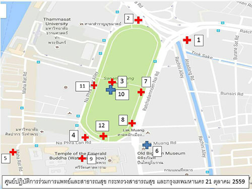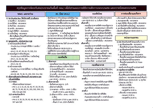 บริษัท ท่าอากาศยานไทย จำกัด (มหาชน) ร่วมกับกระทรวงคมนาคม จัดรถโดยสารปรับอากาศให้บริการประชาชนจากท่าอากาศยานสุวรรณภูมิ (ทสภ.) เส้นทาง ทสภ.-โรงแรมรัตนโกสินทร์ ถนนราชดำเนินกลาง โดยไม่คิดค่าใช้จ่ายแก่ผู้โดยสาร ผู้ใช้บริการ และประชาชนทั่วไปที่ประสงค์เดินทางไปร่วมแสดงความอาลัยและถวายบังคมพระบรมศพ พระบาทสมเด็จพระปรมินทรมหาภูมิพลอดุลยเดช มหิตลาธิเบศรามาธิบดี จักรีนฤบดินทร สยามินทราธิราช บรมนาถบพิตร ณ พระบรมมหาราชวัง โดยจะเริ่มให้บริการตั้งแต่บัดนี้จนถึงวันที่ 15 พฤศจิกายน 2559 ระหว่างเวลา 09.00 - 14.00 น. ซึ่งจะมีรถออกทุก 1 ชั่วโมง พร้อมทั้งบริการน้ำดื่ม และลูกอมด้วย ทั้งนี้ ประชาชนสามารถขึ้นรถได้ที่บริเวณชานชาลาด้านหน้าประตู 8 ชั้น 1 อาคารผู้โดยสาร ทสภ.