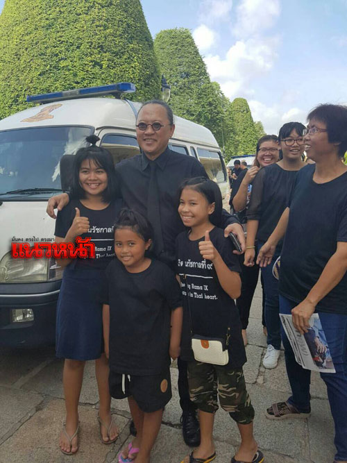 ขณะที่ ติ๊ก กลิ่นสี ชาญณรงค์ ขันทีท้าว พิธีกรและดารานักแสดง เดินทางมาพร้อมกับซูโม่กิ๊ก เกียรติ กิจเจริญ พิธีกรชื่อดัง และคณะเพื่อเข้าสักการะถวายความอาลัย