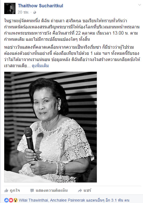 ในฐานะผู้จัดคนหนึ่ง ดิฉัน ถ่ายเถา สุจริตกุล ขอเรียนให้ทราบทั่วกันว่า กำหนดนัดร้องเพลงสรรเสริญพระบารมีให้ก้องโลกที่บริเวณถนนหน้าพระลาน กำเเพงพระบรมมหาราชวัง คือวันเสาร์ที่ 22 ตุลาคม เริ่มเวลา 13.00 น. ตามกำหนดเดิม และไม่มีการเปลี่ยนแปลงใดๆ ทั้งสิ้น