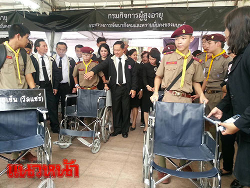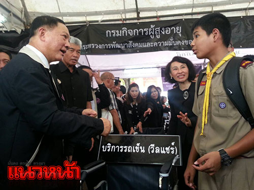 21 ต.ค. 59 เวลา 12.30 น. ที่บริเวณท้องสนามหลวง พล.ต.อ.อดุลย์ แสงสิงแก้ว รัฐมนตรีว่าการกระทรวงการพัฒนาสังคมและความมั่นคงของมนุษย์ ลงพื้นที่ตรวจเยี่ยมจุดบริการประชาชน “พม.เพื่อหลวง” ตั้งอยู่บริเวณรอบสนามหลวง ฝั่งตรงข้ามวัดมหาธาตุ เพื่อบริการประชาชน โดยช่วยเหลือเมื่อมีเด็กพลัดพรากกับผู้ปกครอง บริการดูแลเด็กที่หลงทางก่อนส่งคืนผู้ปกครอง ให้คำปรึกษาแนะนำ บริการรถเข็นนั่งสำหรับคนพิการและผู้สูงอายุ (วีลแชร์) แจกและสาธิตการทำริบบิ้น ยาดม และยาหม่อง มีบริการถุงผ้าใส่ของ บริการตัดผม และรับบริจาคเสื้อผ้าเด็กและผู้ใหญ่ ที่จะนำมาย้อมสีดำสำหรับแจกจ่าย พร้อมทั้งบริการและอำนวยการความสะดวกต่างๆ