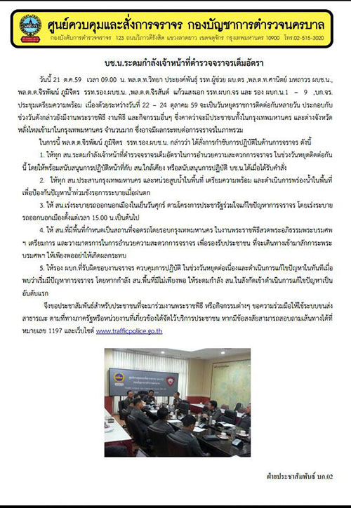 21 ต.ค.59 เวลา 09.00 น. พล.ต.ท.วิทยา ประยงค์พันธุ์ รรท.ผู้ช่วย ผบ.ตร ,พล.ต.ท.ศานิตย์ มหถาวร ผบช.น., พล.ต.ต.จิรพัฒน์ ภูมิจิตร รรท.รอง.ผบช.น. ,พล.ต.ต.จิรสันต์ แก้วแสงเอก รรท.ผบก.จร และ รอง ผบก.น.1 – 9 ,บก.จร.ประชุมเตรียมความพร้อม เนื่องด้วยระหว่างวันที่ 22 – 24 ตุลาคม 59 จะเป็นวันหยุดราชการติดต่อกันหลายวัน ประกอบกับช่วงวันดังกล่าวยังมีงานพระราชพิธี งานพิธี และกิจกรรมอื่นๆ ซึ่งคาดว่าจะมีประชาชนทั้งในกรุงเทพมหานคร และต่างจังหวัดหลั่งไหลเข้ามาในกรุงเทพมหานคร จำนวนมาก ซึ่งอาจมีผลกระทบต่อการจราจรในภาพรวม