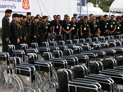 21 ต.ค. 59 ที่กองอำนวยการร่วมรักษาความสงบเรียบร้อย (กอร.รส.)บริเวณโดยรอบพระบรมมหาราชวัง นำโดยนายเอกชัย แซ่เตียว ทีมชมรมสองล้อใจบุญ เกื้อหนุนผู้ยากไร้ ได้มอบรถเข็นวีลแชร์จำนวน 149 คันเพื่อนำไปอำนวยความสะดวกพร้อมให้บริการแก่ผู้พิการและผู้สูงอายุ ที่เดินทางมาถวายสักการะพระบรมศพเบื้องหน้าพระบรมฉายาลักษณ์เเละลงนามเพื่อถวายความอาลัยแด่พระบาทสมเด็จพระปรมินทรมหาภูมิพลอดุลยเดช โดยมีพล.ต.พงษ์สวัสดิ์ พรรณจิตต์ รองแม่ทัพภาคที่ 1 เป็นผู้รับมอบ