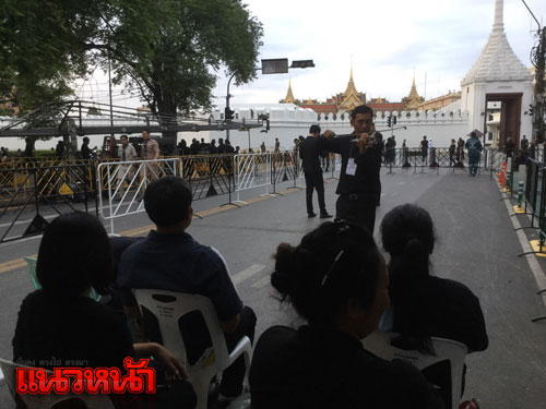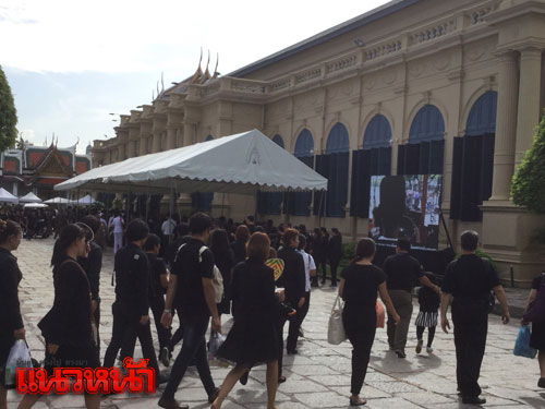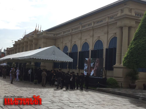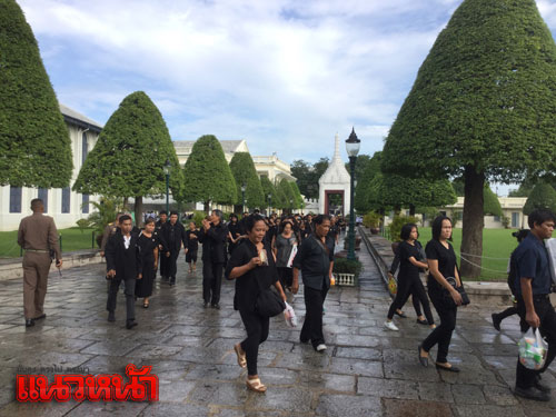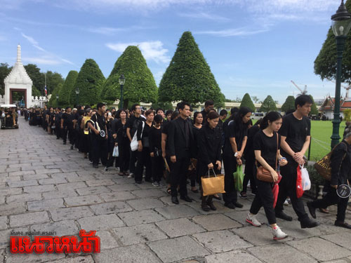 22 ต.ค.59 สำหรับบรรยากาศที่หน้าประตูวิเศษไชยศรี พระบรมมหาราชวัง ประชาชนจากทั่วสารทิศเดินทางหลั่งไหลมาเป็นจำนวนมากเพื่อต่อแถวรอคิวเข้าถวายสักการะเบื้องหน้าพระบรมฉายาลักษณ์ และลงนามสมุดหลวงถวายความอาลัยพระบรมศพพระบาทสมเด็จพระปรมินทรมหาภูมิพลอดุลยเดช ที่ศาลาสหทัยสมาคม ในพระบรมราชวัง เป็นวันที่ 8 โดยในวันนี้มีประชาชนเดินทางมารอเข้าถวายความอาลัยมาากว่าปกติ เนื่องจากเป็นวันหยุดราชการจึงได้เดินทางมาร่วมแสดงความอาลัยถวายแด่พระบาทสมเด็จพระปรมินทรมหาภูมิพลอดุลยเดช เป็นจำนวนมาก โดยเริ่มแถวตั้งแต่แยกหน้าประตูวิเศษไชยศรี ผ่านหน้ากรมศิลปากร ผ่านหน้าวัดมหาธาตุฯ วนเข้าเลียบถนนรอบท้องสนามหลวง โดยประชาชนที่เดินทางมาบอกว่าภายหลังถวายความอาลัยแล้วจะรอเข้าร่วมกิจกรรมร้องเพลงสรรเสริญพระบารมีที่ท้องสนามหลวงด้วย