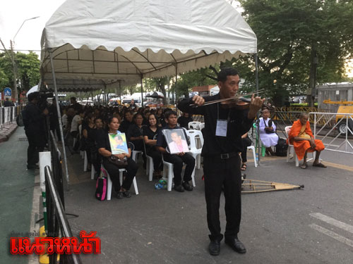 ด้าน นายโรจน์ไพศาล เอี่ยมสุวรรณ เดินทางมาจากหมู่บ้านทรัพย์เจริญ เขตลาดกระบัง กทม. ถึงหน้าพระบรมมหาราชวัง เวลา 19.00 น. เพื่อมาเข้าคิวรอแสดงความอาลัย ขณะรอได้สีไวโอลิน บทเพลงพระราชนิพนค์ไกล้รุ่ง แสงเทียน บัวขาว ถวายพระองค์ และเพื่อให้ประชาชนที่มารอได้บรรเทาความโศกเศร้า