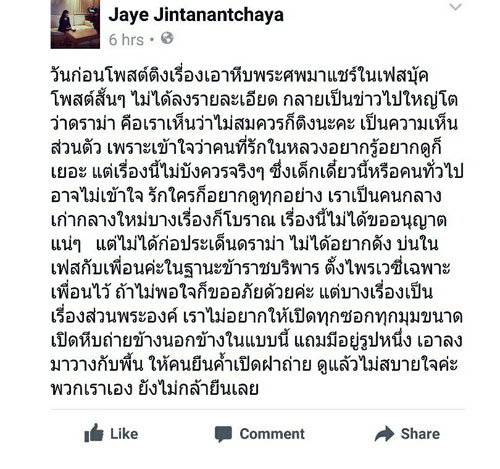 ล่าสุด ดร.จินตนันท์ ได้โพสต์ผ่านเฟสบุ๊คส่วนตัว Jaye Jintanantchaya ถึงกรณีดังกล่าวอีกครั้ง โดยระบุว่า ที่ตำหนิ บริษัท สุริยาหีบศพ ไปนั้น เพราะเห็นว่า การโพตส์รูป หีบพระศพ ลงในโลกออนไลน์ เป็นเรื่องที่ไม่สมควรอย่างยิ่ง และบางภาพมีคนยืนค้ำหีบพระศพ พร้อมให้เหตุผลว่า เป็นเรื่องมิบังควรอย่างยิ่ง ซึ่งแม้ว่าเรื่องดังกล่าวเป็นที่สนใจของคนทั่วไป แต่ถือเป็นเรื่องส่วนพระองค์ และที่สำคัญเชื่อว่า ไม่ได้มีการขออนุญาตเผยแพร่แต่อย่างใด ซึ่งตนเองในฐานะข้าราชบริพาร เห็นแล้วไม่สบายใจ พร้อมยืนยันว่า ไม่มีเจตนาก่อประเด็นดราม่า หรือสร้างกระแสแต่อย่างใด