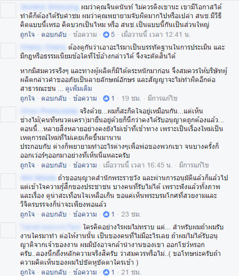 ต่อมา ได้มีผู้เข้ามาแสดงความคิดเห็นถึงข้อติติงดังกล่าว โดยระบุว่า เห็นด้วยกับข้อความดังกล่าว ว่าเป็นการมิบังควร อาทิ "เรื่องบางเรื่องสมควรเป็นรู้กันภายในมากกว่า ไม่รู้สุริยาเอามาเผยเเพร่เพื่ออะไร ไม่อยากคิดเลยว่าอยากจะโชว์ เพื่อฉวยโอกาส","ไม่บังควรครับ ไม่จำเป็นต้องเปิดเผย ยกเว้นว่า ขอพระบรมราชานุญาตก่อน" แต่มีจำนวนไม่น้อย ที่อ้างว่า เป็นเรื่องที่อยู่ในความสนใจของคนไทย ไม่ใช่เรื่องเสียหายแต่อย่างใด เช่น "ให้ประชาชนเห็นบ้างเถอะ คนมันรัก ก็อยากเห็นทุกรายละเอียด ไม่น่ามีอะไรเสียหาย", "ใครก็อยากเห็นครั้งสุดท้าย ไม่ล่วงเกินหรอก. ให้ผ่าน ไปปราบพวกหมิ่นเบื้องสูงเถิด" เป็นต้น
