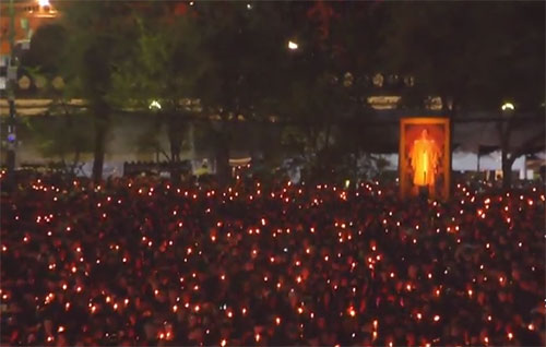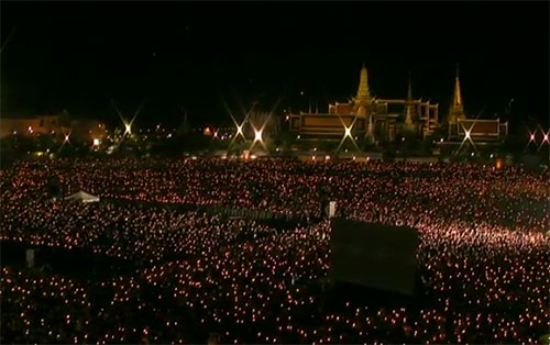 22 ต.ค. 59 เมื่อเวลา 22.00 น. ประชาชนที่มารวมตัวกันบริเวณรอบๆ พื้นที่สนามหลวง และหน้าพระบรมมหาราชวัง ได้ร่วมกันร้องเพลง "สรรเสริญพระบารมี" เพื่อน้อมรำลึกถึงพระมหากรุณาธิคุณของพระบาทสมเด็จพระปรมินทรมหาภูมิพลอดุลยเดช โดยร่วมกันร้องขับขานบทเพลงจนดังกึกก้องไปทั่วพื้นที่บริเวณดังกล่าว หลังจากเมื่อเวลา 13.00 น. ได้มีการร้องเพลงร่วมกับวงออเคสต้า โดยมี อ.สมเถา สุจริตกุล เป็นวาทยกร ซึ่งการร้องเพลงในวันนี้ ได้มีการจัดทำเป็นภาพยนตร์และวิดีทัศน์เพื่อฉายในโรงภาพยนตร์ทั่วประเทศ และสถานีโทรทัศน์ช่องต่างๆ ต่อไป โดยทีมงานของ ม.จ.ชาตรีเฉลิม ยุคล