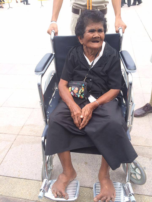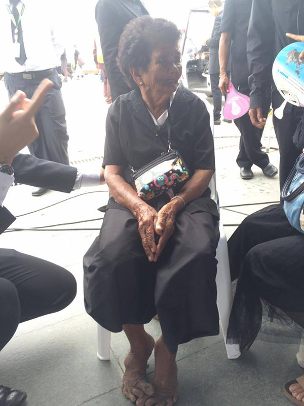 29 ต.ค. 59 เพจเฟซบุ๊ก "FM91 Trafficpro" เปิดเผยเรื่องราวของ "คุณยายแดง" วัย 82 ปี ชาวจังหวัดตรัง ซึ่งเดินทางมายังสนามหลวง เพื่อถวายความอาลัยพระบาทสมเด็จพระปรมินทรมหาภูมิพลอดุลยเดช แต่ไม่กล้าเข้าไปถวายบังคมพระบรมศพในพระที่นั่งดุสิตมหาปราสาท ในพระบรมมหาราชวัง เนื่องจากเกรงว่าเจ้าหน้าที่จะไม่ให้เข้า เพราะตัวเองไม่มีรองเท้าสวมใส่ จึงไม่กล้าไปต่อคิว แต่สุดท้ายคุณยายวัย 83 ก็ได้เข้าไปถวายบังคมหน้าพระบรมศพอย่างที่ตั้งใจด้วยความปลาบปลื้่มและดีใจ