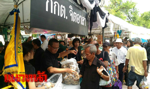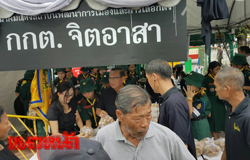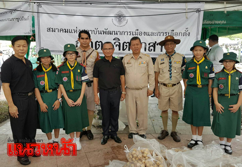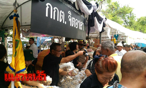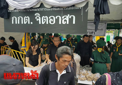 31 ต.ค.59 ผู้สื่อข่าวรายงานว่า ที่บริเวณท้องสนามหลวง เต็นท์ที่ 32 ของ กกต.จิตอาสา เยื้องประตูทางเข้ามหาวิทยาลัยธรรมศาสตร์ นายศุภชัย สมเจริญ ประธานกรรมการการเลือกตั้ง พร้อมด้วยเจ้าหน้าที่สำนักงาน กกต. ลูกเสืออาสา กกต. และตัวแทนนักเรียนจากโรงเรียนศึกษานารี จำนวน 80 คน ร่วมกันแจกลองกองตันหยงมัส ของดีจังหวัดนราธิวาส กว่า 1,000 กิโลกรัม ให้กับประชาชน เพื่อถวายเป็นพระราชกุศลแด่พระบาทสมเด็จพระปรมินทรมหาภูมิพลอดุลยเดช ภายในบริเวณโดยรอบท้องสนามหลวง