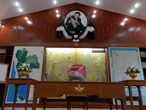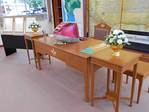 ในห้องทรงงาน ที่พระบาทสมเด็จพระปรมินทรมหาภูมิพลอดุลยเดช ทรงคิดค้นปรากฏเป็นแผนภาพประมวลขั้นตอนกรรมวิธี การทำฝนหลวง 6 ขั้นตอน ภายในยังมีภาพถ่ายฝีพระหัตถ์ที่พระองค์ทรงถ่ายภาพ ขณะพบมวลเมฆจับตัวกันจนเกิดฝนที่ทะเลหัวหิน วังไกลกังวล พระราชทานให้กับศูนย์ปฎิบัติการฝนหลวง นอกจากตำราฝนหลวงพระราชทาน และภาพถ่ายฝีพระหัตถ์จากวังไกลกังวลแล้ว ในห้องทรงงานมีดินสอ เข็มทิศ สารฝนหลวง ที่เป็นสูตรที่ทรงคิดค้น และแผนที่ประเทศไทยขนาด 1 ต่อ 2 แสน 5 หมื่น หลังด้านหลังของโต๊ะทรงงานในห้องทรงงานฝนหลวง ที่ศูนย์ฝนหลวงหัวหิน สนามบินบ่อฝ้าย จังหวัดประจวบคีรีขันธ์