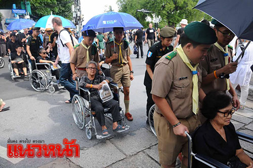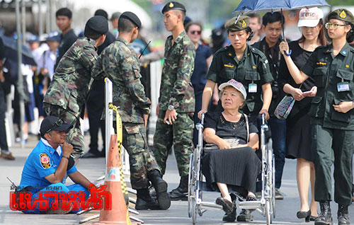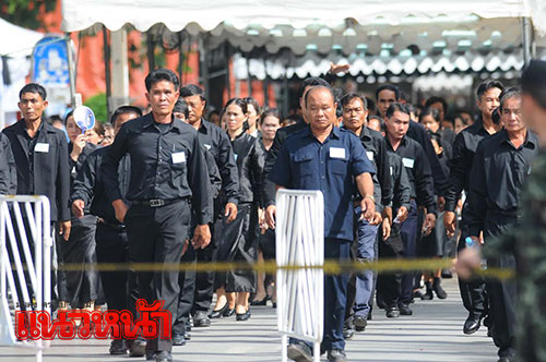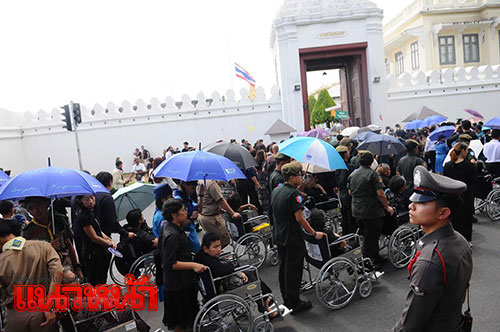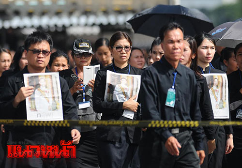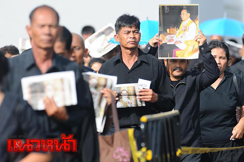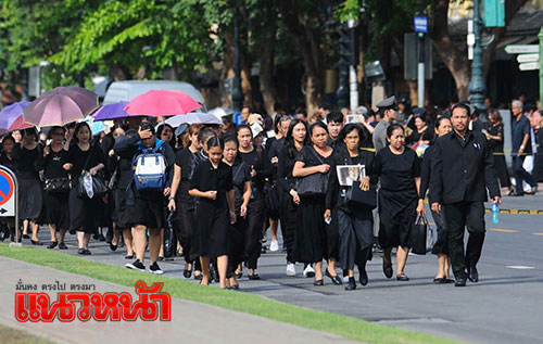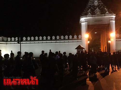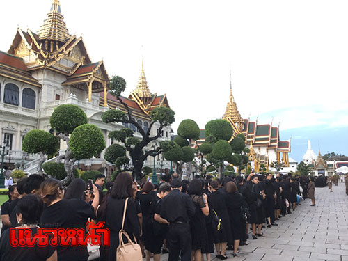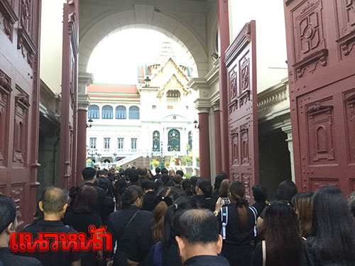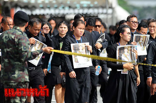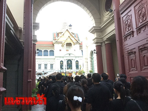 1 พ.ย. 59 ผู้สื่อข่าวรายงานว่า ตามที่มีพระราชทานพระบรมราชานุญาตให้ประชาชนเข้าถวายสักการะพระบรมศพพระบาทสมเด็จพระปรมินทรมหาภูมิพลอดุลยเดช เบื้องหน้าพระบรมโกศ ณ พระที่นั่งดุสิตมหาปราสาท ได้ตั้งแต่วันที่ 29 ต.ค.เวลา 08.00-21.00 น. ทุกวัน (ยกเว้นช่วงมีพระราชพิธีบนพระที่นั่งดุสิตมหาปราสาท) นั้น ซึ่งในเช้าวันนี้ ได้มีพสกนิกรจำนวนมากทั้งในกรุงเทพฯและต่างจังหวัด โดยแต่งกายไว้ทุกข์มารอคิวที่บริเวณเต้นด้านหน้ากรมศิลปากรถึงวัดมหาธาตุฯ ซึ่งเจ้าหน้าที่ได้จัดเตรียมเก้าอี้ไว้บริการเพื่อนั่งรอเข้าถวายสักการะหน้าพระบรมศพพระบาทสมเด็จพระปรมินทรมหาภูมิพลอดุลยเดช อย่างเนืองแน่น ด้วยความโศกเศร้าเสียใจและอาลัยยิ่ง