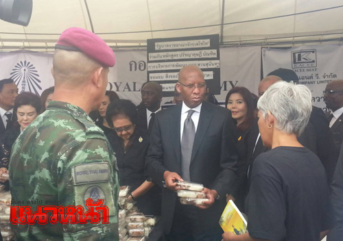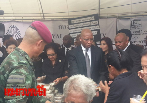 2 พ.ย.59 ผู้สื่อข่าวรายงานว่า เมื่อเวลา 15.00 น. ที่บริเวณโซนเหนือ เต็นท์ 44 ของกองทัพบก Mr.Kimmetso Mathaba รัฐมนตรีจากสำนักนายกรัฐมนตรี และ Mr.Mateye Nena อธิบดีกรมเอเซียและแปซิฟิค แห่งราชอาณาจักรเลโซโท มอบข้าวเหนียวไก่ จำนวน 800 กล่อง ที่เต็นท์ที่ 44 กองทัพบก ให้ประชาชนที่มาถวายสักการะพระบรมศพเบื้องหน้าพระบรมโกศพระบาทสมเด็จพระปรมินทรมหาภูมิพลอดุลยเดช โดยมีประชาชนเข้าแถวรอข้าวเหนียวไก่ทอดเป็นจำนวนมาก ทั้งนี้ ระหว่างเดินทางมายังเต็นท์เพื่อแจกของนั้น ได้ทักทายประชาชนที่มาบริเวณรอบๆ ท้องสนามหลวงด้วย