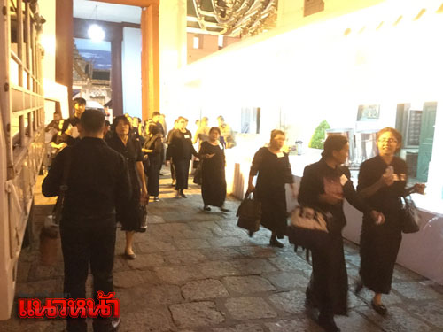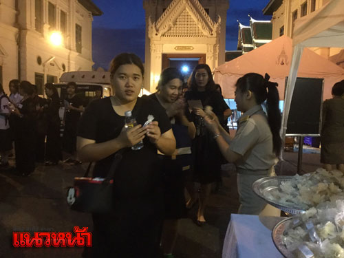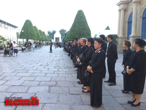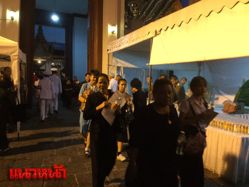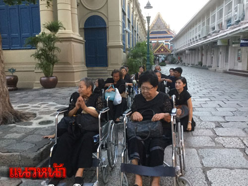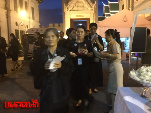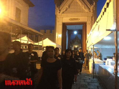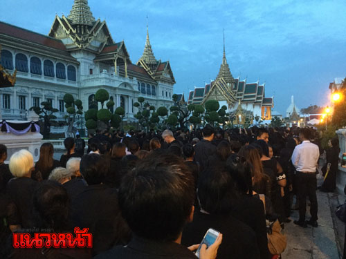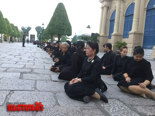 5 พ.ย.59 ผู้สื่อข่าวรายงานบรรยากาศการกราบถวายบังคมพระบรมศพ พระบาทสมเด็จพระปรมินทรมหาภูมิพลอดุลยเดช ที่บริเวณเต๊นท์จุดรอคอย ได้มีประชาชนจากทั่วทุกสารทิศเดินทางมานั่งพักอยู่ภายในเต๊นท์รอคอยเริ่มจากหน้ากรมศิลปากรผ่านหน้าวัดมหาธาตุฯ และมีแถวยาวไปถึงแยกท่าพระจันทร์หลายคนยืนสงบนิ่ง เพื่อรอเข้ากราบถวายสักการะะพระบรมศพพระบาทสมเด็จพระปรมินทรมหาภูมิอดุลยเดช เบื้องหน้าพระบรมโกศ ณ พระที่นั่งดุดสิตมหาปราสาท ในพระบรมมหาราชวัง