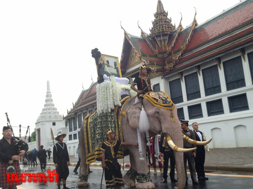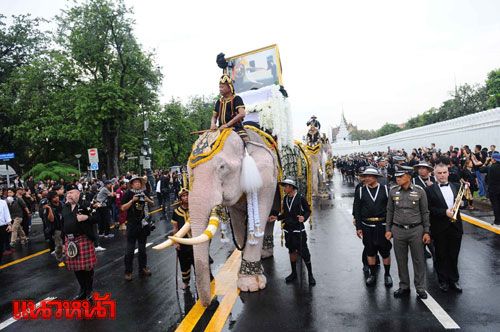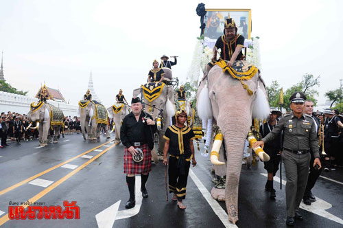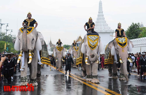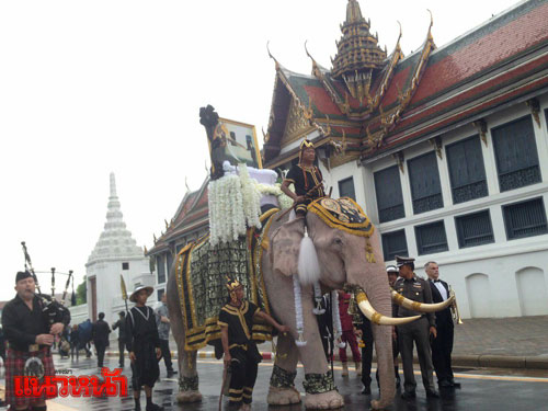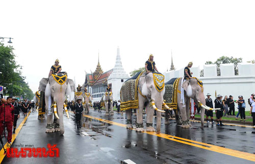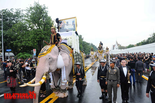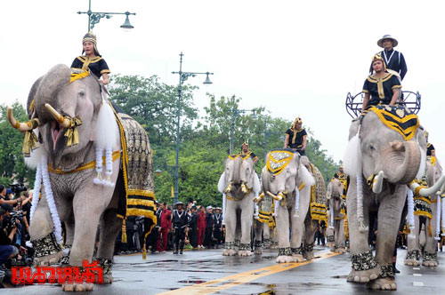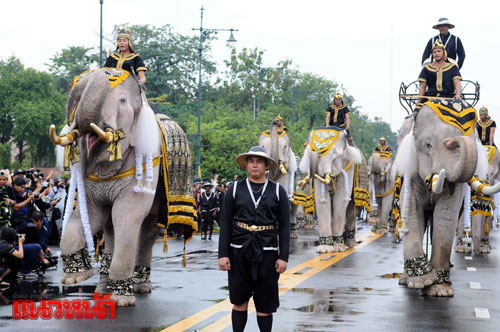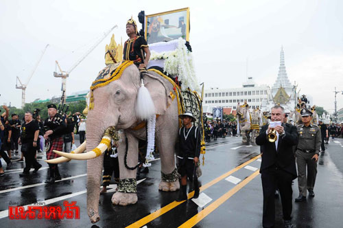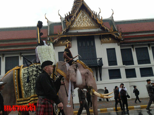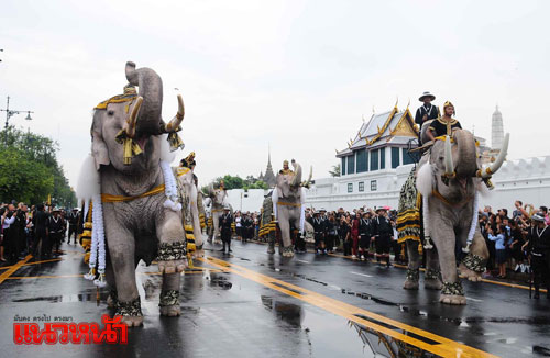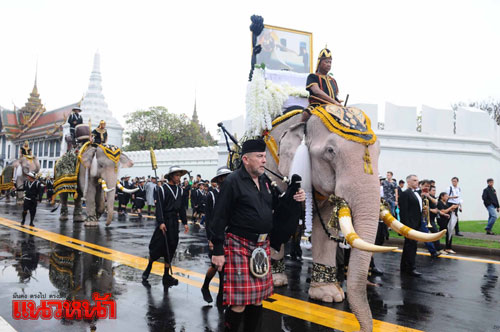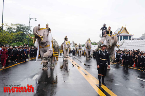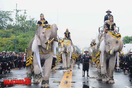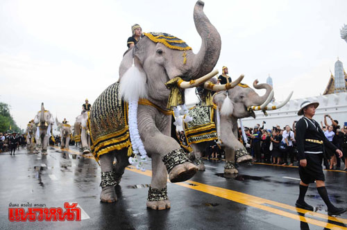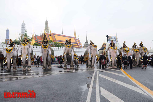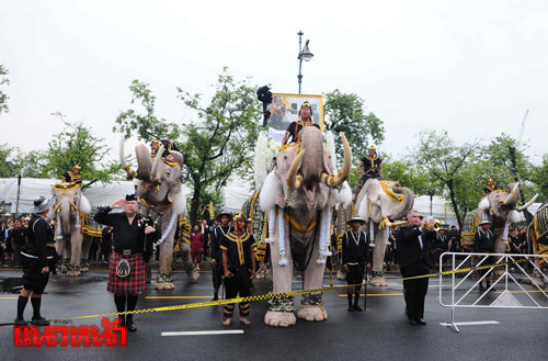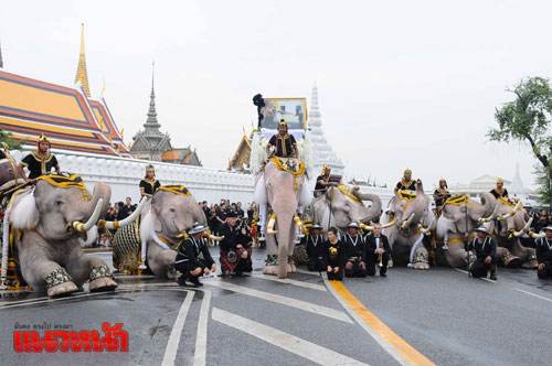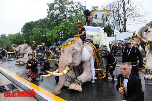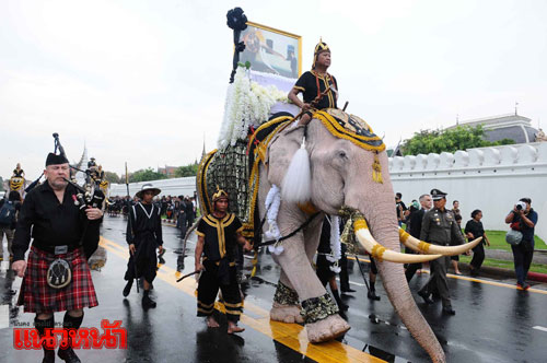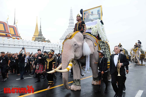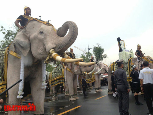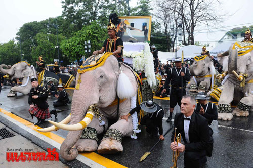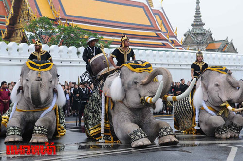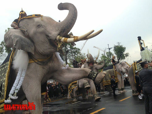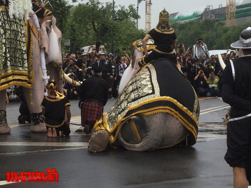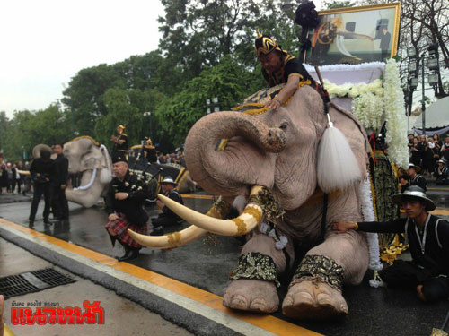 อย่างไรก็ตาม เมื่อถึงเวลาเจ้าหน้าที่วังช้างได้บรรเลงเพลงสรรเสริญพระบารมี ช้างทั้ง 11 เชือก ได้ยืนตรง ซึ่งประชาชนที่อยู่บริเวณโดยรอบได้ร่วมกันร้องเพลง และเมื่อจบเพลงช้างทุกเชือกได้ชูงวงขึ้น พร้อมหมอบลงทำท่ากราบ เพื่อแสดงความเคารพ จากนั้นได้คำรามดังเสียงดังกึกก้อง